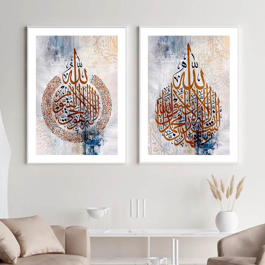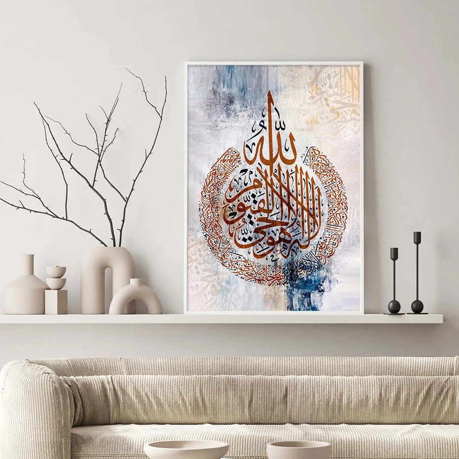 Tableau décoratif représentant le verset Ayat-al-kursi en calligraphie islamique sur un fond abstrait.